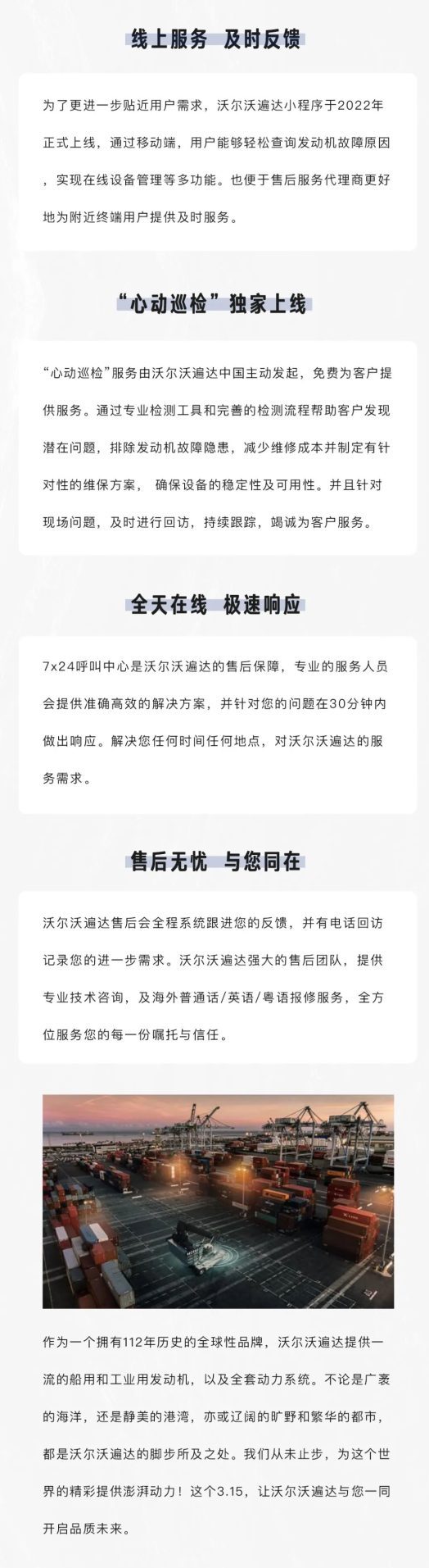 沃爾沃遍達7×24小時的服務,用完整的售后服務體系,為客戶提供確保安裝、操作和維護的一站式服務。